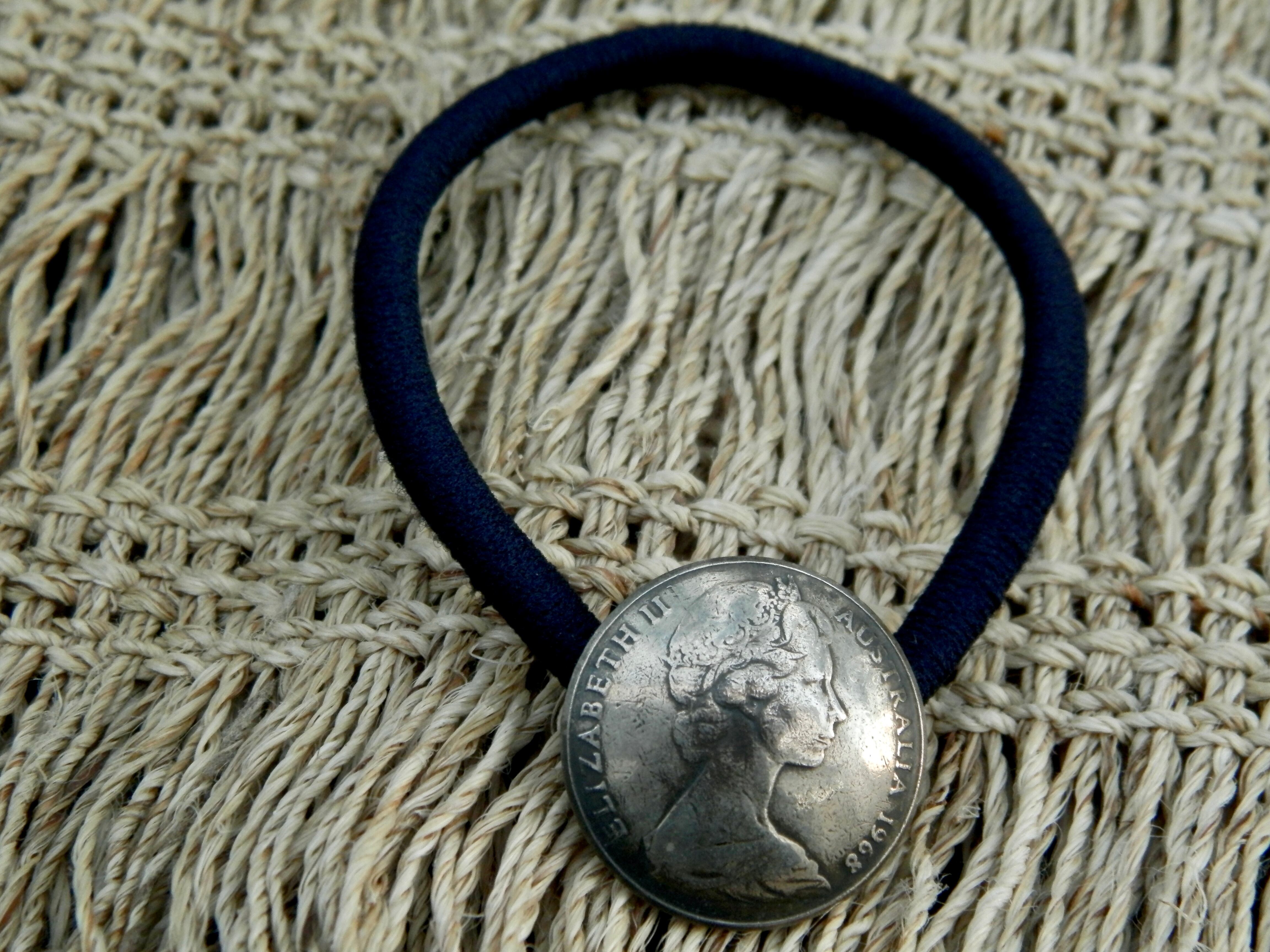 オーストラリアの20centエリザベス・コインをヘアゴムと芯合わせしコンチョ型に加工した作品です。