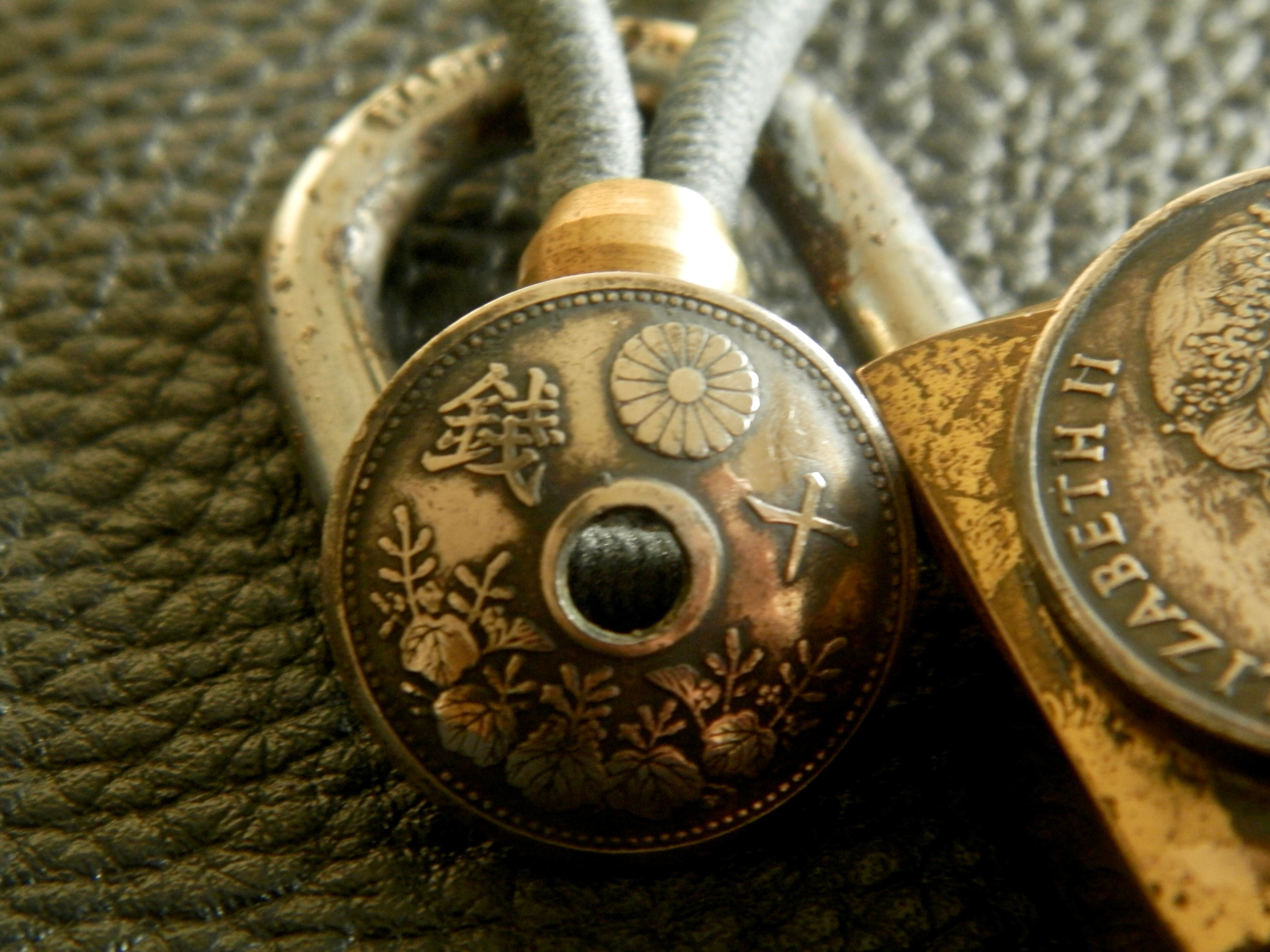 大正・昭和の白銅貨十銭をヘアゴムと芯合わせしコンチョ型に加工した作品です。
