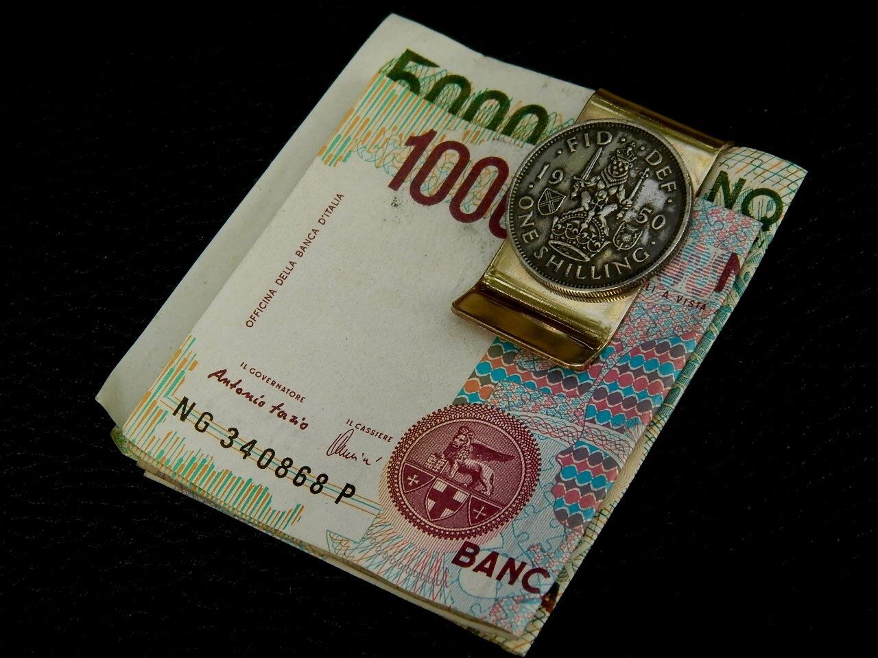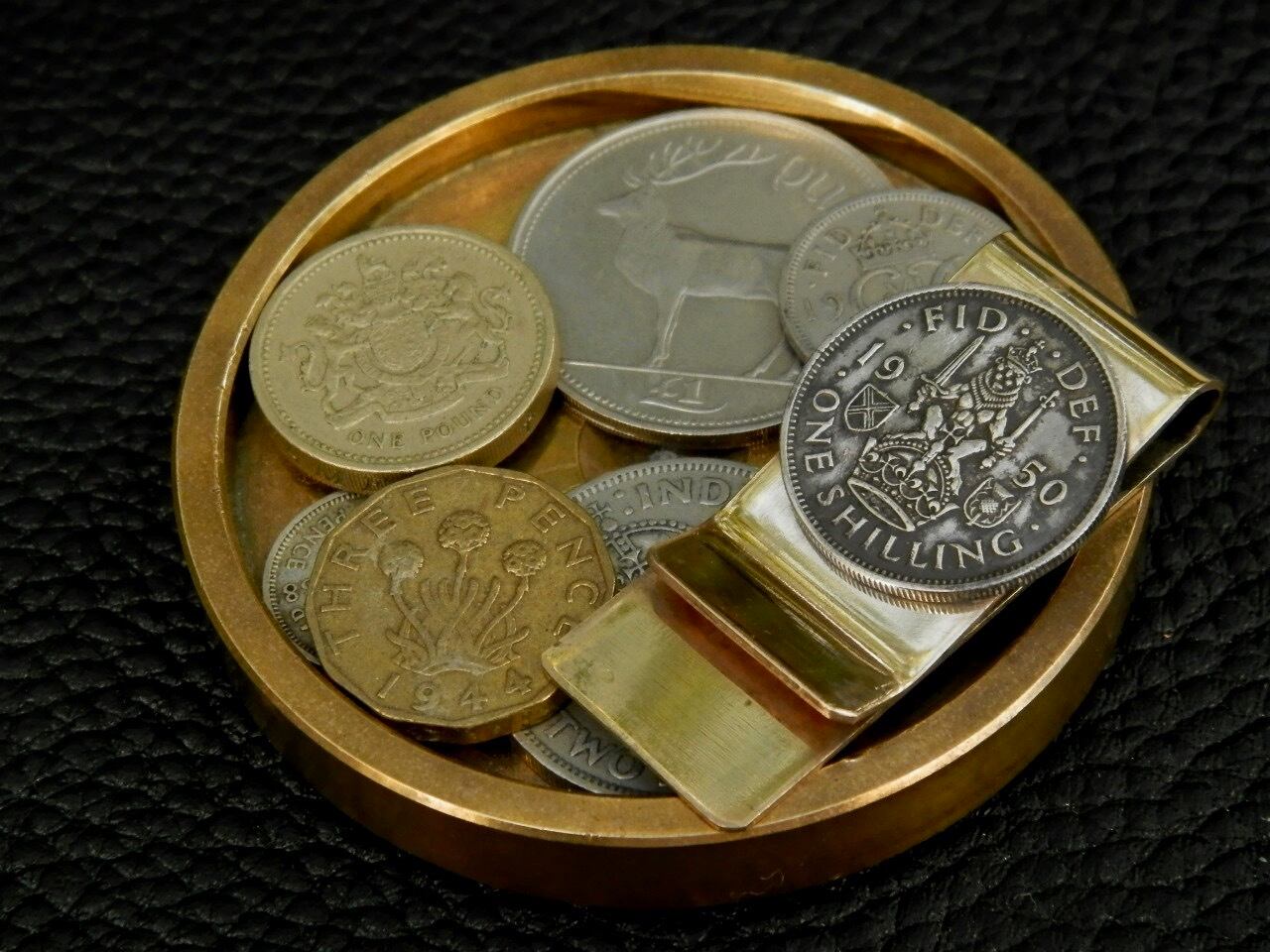 英国の旧コイン1シリングを真鍮製のマネークリップに装飾した作品です。