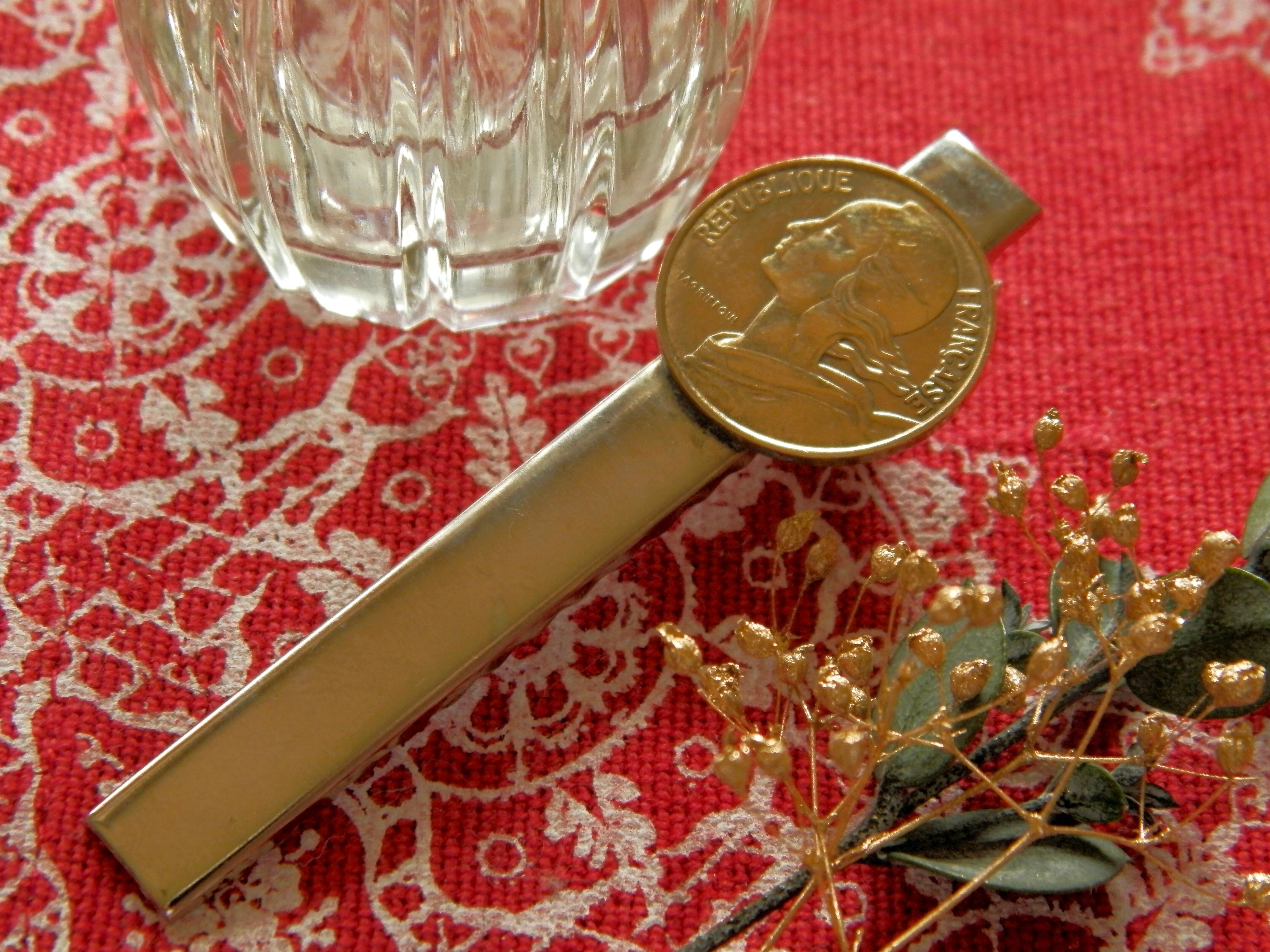フランスの10centimeコインLiberty Headをフラットメタルのクリップに装飾した作品です。