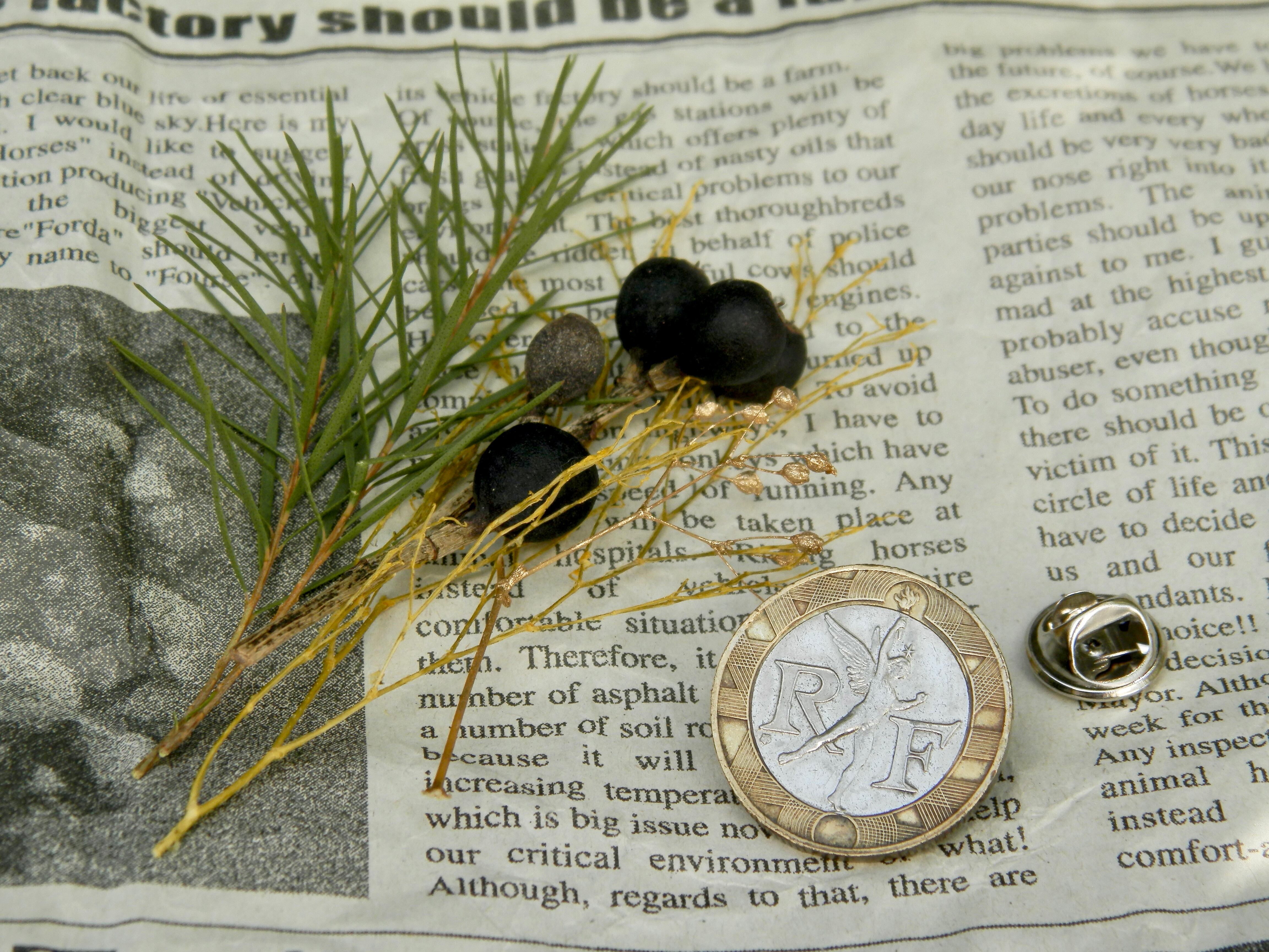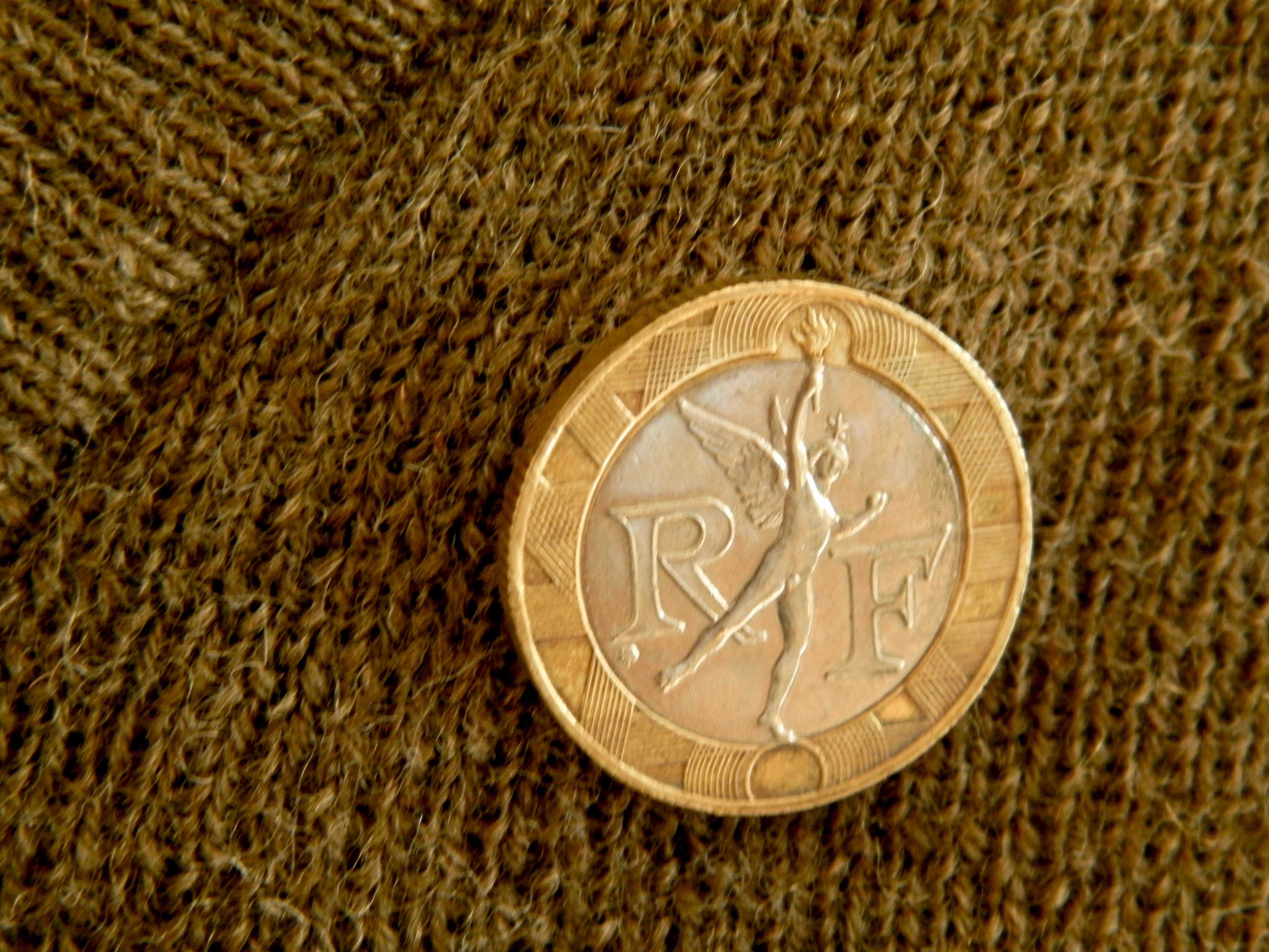 フランスの10Fコインにメタルピンを取り付けた作品です。