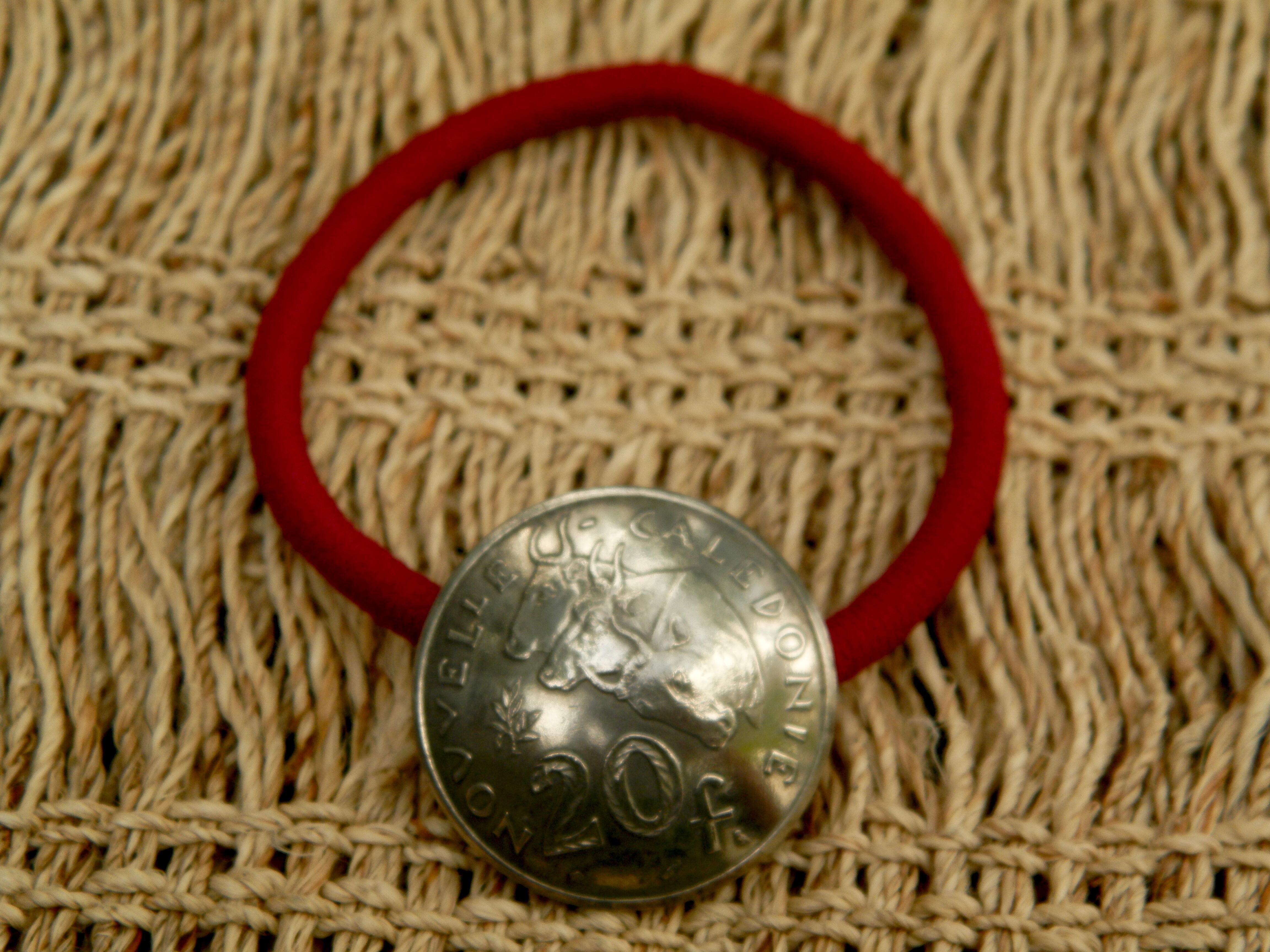 希少なニューカレドニアの20fコインをヘアゴムと芯合わせしコンチョ型に加工した作品です。